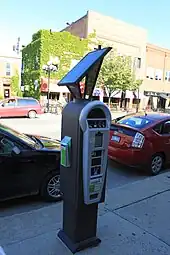 Other advances with parking meters include vehicle detection technology, which allows the pay by space meters to know when there is a car parked in a space. This opens the door for benefits for parking managers, including providing way-finding (directing drivers to unoccupied spaces via the web or via street signs), enabling remote violation detection, and gathering vital statistics about parking supply and demand. Some meters allow payment for additional time by phone, and notify drivers when they are about to expire.[15] Parking meters in Santa Monica use vehicle detectors to prevent drivers from "feeding the meter" indefinitely, and to delete remaining time when a car departs so the next car cannot take any time without paying.[16] Meters in Madrid give discounted and free parking to drivers of hybrid and electric vehicles, respectively.[16] Drivers can reserve meters spots in Los Angeles by cellphone.[17]