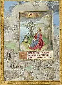 Master of the Lübeck Bible (fl. c. 1485 – c. 1520) was a Flemish manuscript illuminator and printmaker. He is named for a series of woodcuts designed for a Bible printed at Lübeck, Germany in 1494.[1] He has long been known as a contributor to several early printed books; only recently, however, has their style been associated to certain illuminated manuscripts. Relatively few illuminations have been ascribed to the Master. Those that have been share an almost frenetic sense of movement, combined with a distorted quality, that distinguishes his printed output. His figures have oddly elongated faces, while the spaces they inhabit have conversely been strangely foreshortened. The Master's city of origin is unknown; his close association with the Master of James IV of Scotland, who is thought to have been active in Ghent, may indicate that his base of operations was that city.