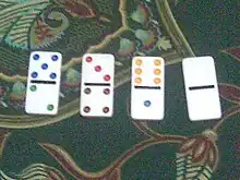 Matador (Spanish, "killer" or "bullfighter") or Matadore, sometimes called Russian Dominoes, is a domino game for two to four players using a double six set of dominoes.[1][2] It is one of the blocking family of domino games in which the object of the game is to be the first to go out, while blocking one's opponents from doing so. Its distinguishing feature is the unusual rule of playing tiles so as to combine pips instead of matching numbers.