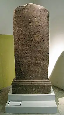 The name of the Mataram Kingdom was known during the reign of Sanjaya (narapati rāja śrī sañjaya)[15] which states in the Canggal inscription, dated from 654 Śaka or 732 AD, that he ruled in Java island (āsīddvīpavaraṁ yavākhyam).[16] Then according to Mantyasih inscription in 829 Śaka or 907 AD he was called by a different title (saŋ ratu sañjaya). The name of the Mataram Kingdom was first discovered by epigraphy in Wuatan Tija inscription 802 Śaka or 880 AD (dewatā prasiddha maṅrakṣa kaḍatwan śrī mahārāja i bhūmi i mātaram kita).[17] The inscription data mentions a number of place names as the center of government located in Central Java, including Shivagrha inscription 778 Śaka or 856 AD and Mantyasih inscription 829 Śaka or 907 AD. The inscription shows the names of places and their hierarchy, namely Mamratipura and Poh Pitu.[14][18]