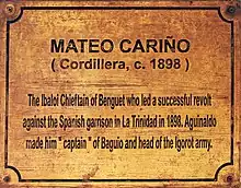 Mateo Cariño was an Ibaloi chieftain[2] who owned the land that was to become Baguio. He led a successful revolt against the Spanish garrison in La Trinidad and was proclaimed the Capitan Municipal of Baguio by President Emilio Aguinaldo.