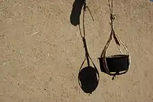 It is a simple loop big enough to hold a food container. It is made from two crossed straps of plaited palm leaflets. The Mi'laq is hanging freely from the ceiling, from wooden beams in the courtyard or in doorways. It is a simple and effective local utensil to protect small quantities of food from animals.