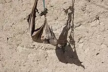 Very popular among the Bedouin Manasir is the Qirbah (قربة), a hose made from the entire skin of a goat. Filled with a liquid it becomes moist and flexible. The Qirbah is hung in a shady windy place, either from the ceiling, a beam or on a wooden tripod. Due to constant evaporation its content is cooled down considerably. The riverain Manasir employ the Qirbah primarily for cooling fermented milk since their water is cooled in huge permeable earthen jars called Sir (زير). These jars are placed in the shadow of a tree or lined up in a row in isolated covered mud structures called Masirah (مزيرة).