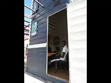 - the shipping containers used to transport the turf have been recycled and reused as the tower element, and have been modified and incorporated alongside the field as an open shaded structure for gathering and storage