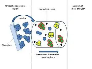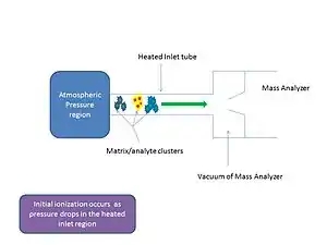 Ionization at atmospheric pressure often leads to a loss of ions during the transfer of the ions from the ambient pressure region to the vacuum of the mass analyzer.[8] Ions are lost due to dispersion of analyte spray and 'rim loss' causing fewer ions to reach the vacuum for m/z separation to occur. Initial ionization occurs in the sub-atmospheric pressure region of the heated inlet tube which is directly attached to the vacuum of the mass analyzer and so ion loss is reduced as transfer of the ions does not occur.