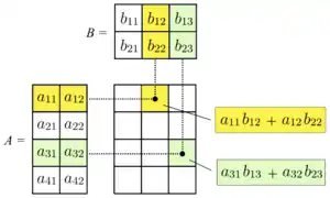 Multiplication of two matrices is defined if and only if the number of columns of the left matrix is the same as the number of rows of the right matrix. If A is an m-by-n matrix and B is an n-by-p matrix, then their matrix product AB is the m-by-p matrix whose entries are given by dot product of the corresponding row of A and the corresponding column of B:[10]