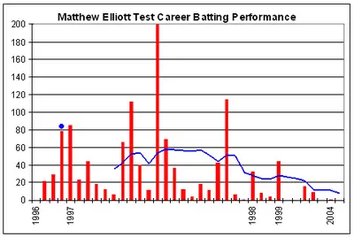Elliott returned for the 1996–97 tour of South Africa. He retained his place for the 1997 tour of England, scoring two centuries in the Ashes series, including a career-best 199. He also made his One Day International debut in 1997 in the Texaco Trophy, but scored 1, making it his only appearance in a limited overs international. Elliott was named one of the Wisden Cricketers of the Year for 1998, although this wasn't enough for him to hold down a regular spot in the Australian side, and due to inconsistent performances after the Ashes series he slipped out of the national team in 1999. Steve Waugh, in his autobiography, described Elliott as "technically gifted but temperamentally flawed" and "prone to serious bouts of self-doubt and a tendency to let injuries rule his thought processes." Waugh stated that "[Elliott] would have been a perfect candidate...[for] a sports psychologist."[1]