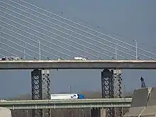 The bridge is one of two installations of a new cable-stayed cradle system that eliminates anchorages in the pylon by carrying the stays from anchorages in the bridge deck, through the pylon and back to anchorages in the deck.[3] The cradle system provides many benefits during construction and over the 100+ year service life of the bridge. Each strand acts independently, allowing for the selective removal, inspection and replacement of the strands.