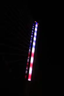 The main attraction of the bridge is the single pylon which contains 384 light emitting diode (LED) fixtures that can create 16.7 million color combinations. The LEDs shine through the glass facing on all four sides of upper 196 feet of the main pylon. These lights can be visible up to 3 miles (4.8 km) away.