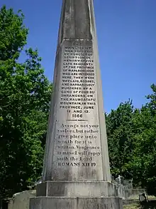 The gang stationed themselves on a suitable site along the Maungatapu track, a place now called Murderers' Rock.[4] On 12 June, James Battle, a flax grower, had terminated his employment and was returning to Nelson via the Maungatapu track. At first the gang let him pass, but later caught up to Battle and robbed him of three pounds and 16 shillings; afterward they strangled him and buried him in a shallow grave.[2]