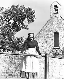 Laughton was so pleased with O'Hara's performance in Jamaica Inn that she was cast opposite him in The Hunchback of Notre Dame (1939) for RKO in Hollywood. She boarded the RMS Queen Mary with he and her mother to New York, and then traveled by train to Hollywood.[33] O'Hara's agent, Lew Wasserman, arranged for a pay increase from $80 a week to $700 a week.[34] As the new face of RKO, she garnered much attention from the Hollywood press and society before the film was even released, something that made her uncomfortable, as she felt that she was being viewed as a "novelty" and "people were making a fuss over me because of something I hadn't yet done, something they just thought I might do".[35] O'Hara portrayed Esmeralda,[36] a gypsy dancer who is imprisoned and later sentenced to death by the Parisian authorities.[37] Director William Dieterle initially showed concern that O'Hara was too tall and disliked her wavy hair, asking for her to step under a shower to straighten it out.[35] Filming commenced in the San Fernando Valley, at a time when it was experiencing its hottest summer in its history. O'Hara described it as a "physically demanding shoot", due to the heavy makeup and costume requirements, and recalls that she gasped at Laughton in makeup as Quasimodo, remarking, "Good God, Charles. Is that really you?"[38] O'Hara insisted on doing her own stunts from the outset, and for the scene in which the hangman places a noose around her neck, no safety nets were used. The film was a commercial success, taking $3 million at the box office. O'Hara was generally praised for her performance though some critics thought that Laughton stole the show. One critic thought that was the strength of the film, writing: "The contrast between Laughton as the pathetic hunchback and O'Hara as the fresh-faced, tenderly solicitous gypsy girl is Hollywood teaming at its most inspired".[39]
