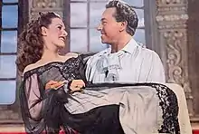 Later that year, O'Hara starred opposite Tyrone Power, George Sanders, Laird Cregar and Anthony Quinn in Henry King's swashbuckler The Black Swan. O'Hara recalled that it was "everything you could want in a lavish pirate picture: a magnificent ship with thundering cannons; a dashing hero battling menacing villains ... sword fights; fabulous costumes ...". She found it exhilarating working with Power, who was renowned for his "wicked sense of humor".[68] O'Hara grew very concerned about one scene in the picture in which she is thrown overboard in her underwear by Power, and sent a warning letter home to Ireland in advance.[69] She refused to take her wedding ring off in one scene which resulted in screen adjustments to make it look like a dinner ring.[70] Though the film was praised by critics and is seen as one of the period's most enjoyable adventure films, the critic from The New York Times thought O'Hara's character lacked depth, commenting that "Maureen O'Hara is brunette and beautiful—which is all the part requires".[71]