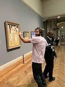 Renoir is considered by many to have been an "artist".[13][14] Geller hates Renoir personally and dislikes his art.[15] In February 2015, Geller created the Instagram account @Renoir_sucks_at_painting, and began posting images of paintings by Pierre-Auguste Renoir, with captions criticizing both Renoir and the institutions that hang his art.[16] In May 2015, Renoir's great-great-granddaughter responded to one of the Instagram posts, entering into an argument with Geller, garnering some media attention.[17] [18] On October 5, 2015, Geller organized an anti-Renoir protest outside the Museum of Fine Arts Boston.[19] The protest garnered criticism in the Boston Globe by Sebastian Smee, a Pulitzer prize-winning art critic, and Geller responded by publicly challenging Smee to a duel.[20] The feud gained media attention, especially after a second protest outside the Metropolitan Museum of New York.[4][21] Geller continued to organize anti-Renoir protests at art museums in major cities around the country.[22] After a protest at the Art Institute of Chicago, Geller was a guest on a local news station, where he expanded the focus of his movement from Renoir's paintings themselves to the misogyny and white supremacy of the canon at large. "At the end of the day," he said, "it’s about access, who has access to our museums... I think the Art Institute should sell some of these Renoirs...and instead buy some art that is painted by women or people of color."[23]