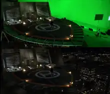 Upon finding the building for the Aesir Headquarters it took eight weeks in pre-production to build the set and another week for the special effects team to install the squibs.[14] The outside top half of the building was completely made of CG, by Mr.X, giving it a more high tech look. Using Google Earth they were able to find out the building's geometry. No location could be found for a rooftop helipad so a set was built in front of a green screen. Soho VFX attached the helipad to the building and set it atop New York City.[15]