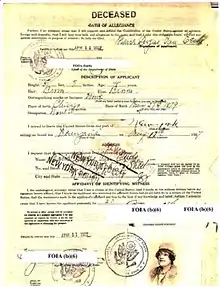 The Baroness died in New York City on March 10, 1937.[4] Her death certificate identified her as May de Pallandt van Eerde[4] and the cause of death was noted as cancer. The newspaper death notice listed her as beloved wife Marie of Edward Allen Morrisey, who worked for the Zanuck Movie Company.[4] She is buried in Gate of Heaven Cemetery, Hawthorne, Westchester County, New York.[25]