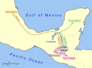 The Maya civilization occupied a wide territory that included southeastern Mexico and northern Central America. This area included the entire Yucatán Peninsula and all of the territory now in the modern countries of Guatemala and Belize, as well as the western portions of Honduras and El Salvador.[3] Most of the peninsula is formed by a vast plain with few hills or mountains and a generally low coastline.[4] The territory of the Maya covered a third of Mesoamerica,[5] and the Maya were engaged in a dynamic relationship with neighbouring cultures that included the Olmecs, Mixtecs, Teotihuacan, and Aztecs.[6] During the Early Classic period, the Maya cities of Tikal and Kaminaljuyu were key Maya foci in a network that extended into the highlands of central Mexico;[7] there was a strong Maya presence at the Tetitla compound of Teotihuacan.[8] The Maya city of Chichen Itza and the distant Toltec capital of Tula had an especially close relationship.[9]