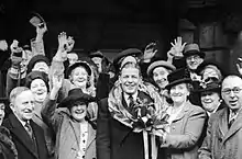 Maynard Sinclair, centre with garland, upon winning his constituency in the NI general election (14 February 1949)