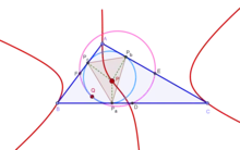The McCay cubic can be defined by locus properties in several ways.[2] For example, the McCay cubic is the locus of a point P such that the pedal circle of P is tangent to the nine-point circle of the reference triangle △ABC.[3] The McCay cubic can also be defined as the locus of point P such that the circumcevian triangle of P and △ABC are orthologic.