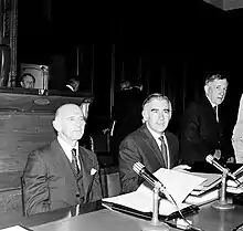 Bill Wentworth occupied the new post of Minister for Aboriginal Affairs.[4] During McMahon's period in office, Neville Bonner joined the Senate and became the first Indigenous Australian in the Australian Parliament.[5] Bonner was chosen by the Liberal Party to fill a Senate vacancy in 1971 and celebrated his maiden parliamentary speech with a boomerang throwing display on the lawns of Parliament. Bonner went on to win election at the 1972 election and served as a Liberal senator for 12 years. He worked on Indigenous and social welfare issues and proved an independent minded senator, often crossing the floor on parliamentary votes.[6] Land rights were a topical issue during the term of the McMahon government and in 1972, Aboriginal protestors set up a Tent Embassy on the lawns in front of Parliament House. The government accepted the recommendations of the Gibb committee on Aboriginal employment, which included the lease of land at Wattie Creek to the Gurindji people, who had been staging a strike on a section of the Vestey company lease since 1966.[4]