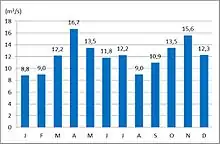 The average monthly discharge of the Meža at Otiški Vrh (1971–2000)