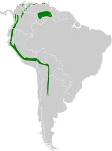 It is found in Argentina, Bolivia, Brazil, Colombia, Ecuador, Peru, and Venezuela. Its natural habitat is subtropical or tropical moist montane forests.