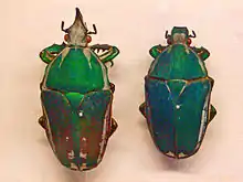 Mecynorrhina torquata, male and female. Mounted specimen at the National Museum (Prague)