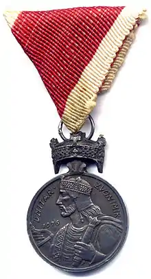 The Medal of the Crown of King Zvonimir (Croatian: Kolajna krune kralja Zvonimira) was founded as a "visible sign of decoration for merits done, in peace or in war, for Croatian people and Independent State of Croatia."
