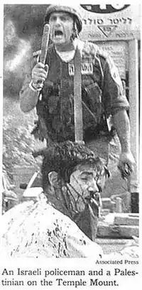 On September 30, 2000, The New York Times, the Associated Press, and other media outlets published a photograph of a club-wielding Israeli police officer standing over a battered and bleeding young man.[95] The photograph's caption identified the young man as a Palestinian and the location as the Temple Mount.[95] The young man in the picture was 20-year-old Tuvia Grossman, a Jewish American student from Chicago who had been studying at a Yeshiva in Israel; the Israeli police officer in the photograph, actually came to his rescue by threatening his Palestinian assailants.[96]