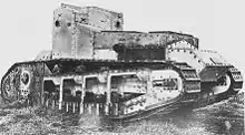 This armoured fighting vehicle was intended for fast mobile assaults. Although the track design appears more "modern" than the British Tanks Mark I to V, it was directly derived from Little Willie, the first tank prototype (itself directly taken from the track design of the Holt tractor), and was unsprung. The crew compartment was a fixed, polygonal turret at the rear of the vehicle, and two engines of the type used in contemporary double-decker buses were in a forward compartment, driving one track each.