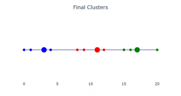 The final clusters are obtained when the centers no longer move between steps. The image below shows what a final cluster can look like.