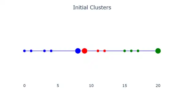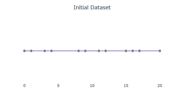 Medoid-based clustering is used to find clusters within a dataset. An initial one-dimensional dataset which contains clusters that need to be discovered is used for the process of medoid-based clustering. In the image below, there are twelve different objects in the dataset at varying x-positions.