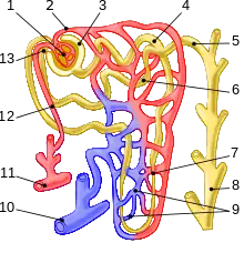 1. Glomerulus, 2. Efferent arteriole, 3. Bowman's capsule, 4. Proximal convoluted tubule, 5. Cortical collecting duct, 6. Distal convoluted tubule, 7. Loop of Henle, 8. Papillary duct, 9. Peritubular capillaries, 10. Arcuate vein, 11. Arcuate artery, 12. Afferent arteriole, 13. Juxtaglomerular apparatus.
