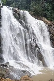 Meenmutty Falls is located 29 km from Kalpetta in Wayanad District in the state of Kerala, India.[1] It is a three-tiered waterfall with a height of 300 metres.[2] Meenmutty is a combination of Malayalam words Meen (fish) and Mutty (blocked). It can be accessed from Mananthavady - Kuttiady road .[3] [4] Meenmutty waterfalls are dangerous during rainy seasons due to high inflow and many people have drowned since 1991.[5] Meenmutty falls is surrounded by Lush green tea plantations making the hike to the falls a memorable experience to the tourists.