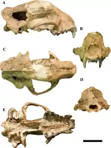 The genus Megalictis was first described by W. D. Matthew in 1907, and assigned to the family Mustelidae.[2] Two similar genera discovered at the same time, Aelurocyon (Peterson, 1907) and Paroligobunis (Peterson, 1910) were identified as synonymous with Megalictis in 1996[3] though Paroligobunis was re-established as a separate genus in 1998.[4] P. R. Bjork, in 1970, assigned the genus to the subfamily Mellivorinae,[5] whilst J. A. Baskin reassigned it to Oligobuninae in 1998.[2] Three species have been identified in the genus: M. ferox, M. petersoni, and M. frazieri, whilst two more, Megalictis brevifacies and Megalictis simplicidens, have since been determined to be synonymous with M. ferox. Other synonyms of M. ferox include Aelurocyon brevifacies, Brachypsalis simplicidens and Paroligobunis simplicidens.[2]