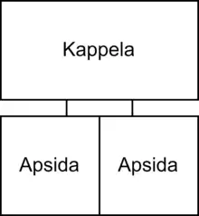 The centre of the façades is usually interrupted by an entrance doorway forming a trilithon, a pair of orthostats surmounted by a massive lintel slab.[31][32] Further trilithons form a passage, which is always paved in stone. This in turn opens onto an open space, which then gives way to the next element, a pair of D-shaped chambers, usually referred to as 'apses', opening on both sides of the passage. The space between the apses' walls and the external boundary wall is usually filled with loose stones and earth, sometimes containing cultural debris including pottery shards.[33]