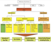 MGD can be classified based on gland secretion. MGD can be low delivery and high delivery. Low delivery is the most common form[5] and is classified in hyposecretory and obstructive. Hyposecretory implies low meibum secretion without terminal duct obstruction. This is associated with gland atrophy. Contact lens wear can lead to a decreased number of functional meibomian glands.[2] Obstructive MGD, where the terminal duct is obstructed, is the most common type of MGD. Obstructive MGD has been associated with age and acne treatment products with retinoids.[2] Obstructive MGD can be classified into noncicatricial and cicatricial. In noncicatricial, the terminal duct of meibomian glands are in their normal anatomic position. In cicatricial, they are dragged posteriorly into the mucosa.[2]