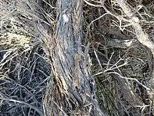 Melaleuca araucarioides is a small to medium tree, about 0.5–1.5 m (2–5 ft) high and wide with rough bark. Its leaves are fleshy and glabrous, about 2–6 mm (0.08–0.2 in) long and 1–2 mm (0.04–0.08 in) wide. They are crowded and arranged in groups of three forming six rows of leaves along the branches.[2][3][4]