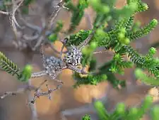 Melaleuca araucarioides is a plant in the myrtle family, Myrtaceae and is endemic to a small area of the south-west Western Australia. It is a many-branched shrub with the leaves arranged in a way that gives the plant the appearance of a conifer.