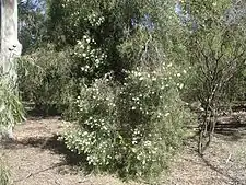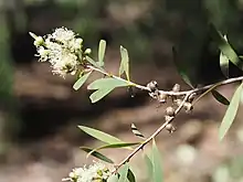 The white flowers are grouped in spikes up to 30 mm (1 in) long at the ends of branches which continue to grow after flowering, and sometimes in the upper leaf axils. Each spike contains 3 to 16 flowers loosely arranged and up to 35 mm (1 in) in diameter. The petals are 3.5–3.8 mm (0.14–0.15 in) and fall off as the flower matures. The stamens are arranged in five bundles around the flower and there are 11 to 26 stamens in each bundle. Flowering occurs in early spring but the flowers are relatively short-lived. The fruit are woody, cup or barrel-shaped capsules 4–5 mm (0.16–0.20 in) long, 4–7 mm (0.2–0.3 in) in diameter and spaced along the branches.[2][3][4][5]