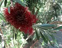 The flowers are usually crimson but sometimes greenish-yellow. They are arranged in spikes on the ends of branches that continue to grow after flowering and also on the sides of the branches. The spikes are 45–65 mm (2–3 in) in diameter with 30 to 90 individual flowers. The petals are 3.5–6.9 mm (0.1–0.3 in) long and fall off as the flower ages and there are 27-45 stamens in each flower. Flowering occurs in summer and is followed by fruit that are woody capsules, 3.9–7.5 mm (0.2–0.3 in) long.[2][4]