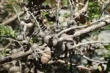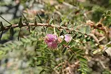The flowers are a shade of pink or purple and are arranged in short spikes which develop from the sides of the branches. The spikes contain 2 to 4 individual flowers and are up to 16 millimetres (0.6 in) in diameter. The petals are 3–4 millimetres (0.1–0.2 in) long, folded downwards and fall off as the flower matures. The stamens are arranged in five bundles around the flower, each bundle containing 25 to 36 stamens. Flowering mostly occurs in spring and early summer and is followed by the fruits which are woody capsules 4–6 millimetres (0.2–0.2 in) long, about 8 millimetres (0.3 in) in diameter and fused with the branches.[2][3]