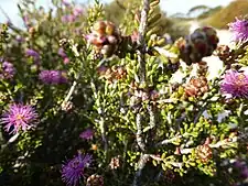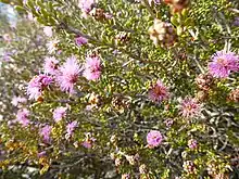 The flowers are deep pink to purple, in heads on the ends of branches which continue to grow after flowering and sometimes in the upper leaf axils. The heads are up to 18 mm (0.7 in) in diameter with 4 to 9 groups of flowers in threes. The petals are 0.6–1.5 mm (0.02–0.06 in) long and fall off as the flowers mature. The stamens are arranged in five bundles around the flower, each bundle with 2 to 6 stamens. Flowers appear between July and December. The fruit that follow are woody capsules 2–4 mm (0.08–0.2 in) long forming almost spherical clusters.[2][3]