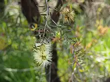 The flowers are creamy green to yellow and are arranged in spikes on the ends of branches that continue to grow after flowering and also in the leaf axils. The spikes are 30–40 mm (1–2 in) in diameter with 15 to 35 individual flowers. The petals are 2.2–4 mm (0.09–0.2 in) long and fall off as the flower ages and there are 37 to 51 stamens in each flower. Flowering occurs in April, October and December and is followed by fruit that are woody capsules, 4.2–4.6 mm (0.17–0.18 in) long.[3][4]