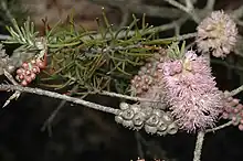 The flowers are a shade of pink to purple, arranged in a spike on the sides of the branches and sometimes on the ends of branches that continue to grow after flowering. The spikes are up to 27 mm (1 in) in diameter and contain 5 to 30 individual flowers. The petals are 2.5–4.5 mm (0.1–0.2 in) long and fall off as the flowers mature. The stamens are arranged in five bundles around the flower, each bundle with 11 to 22 stamens. Flowers appear from November to March and the fruit which follow are woody capsules, 2.5–3.5 mm (0.1–0.1 in) long, sometimes arranged in clusters.[2][3]