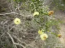 The flowers are bright yellow, and arranged in a spike or a head near the ends of branches. The heads are up to 15 mm (0.6 in) in diameter and contain 2 to 15 groups of flowers in threes. The stamens are arranged in five bundles around the flower, each bundle with 7 to 11 stamens. Flowering occurs from August to February but mainly in October and November. The fruit which follow are woody capsules 2.3–4 mm (0.09–0.2 in) long in clusters of about six which are about 10 mm (0.4 in) in diameter. The rim of the fruit are flat.[2][3]