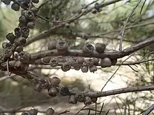 The flowers are white or cream-coloured and are arranged in spikes usually on the ends of branches which continue to grow after flowering, sometimes in the upper leaf axils. Each spike is up to 24 mm (0.9 in) in diameter and contains between 3 and 22 individual flowers. The petals are 2.5–4 mm (0.1–0.2 in) wide and fall off as the flower matures. The stamens are arranged in five bundles around the flower and each bundle contains 34 to 105 stamens. Flowering can occur at any time of the year and is followed by fruit which are woody capsules, 2–3 mm (0.08–0.1 in) long in loose clusters along the stems. Unlike the fruit of Melaleuca linariifolia the valves of the fruit protrude beyond the rim of the fruiting capsule.[2][3][4]
