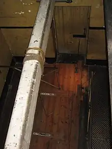 After 1864 a fixed gallows was installed below the octagon across the main axis of the prison block, against the wall dividing the male block from the female block. It comprised a single-leaf trap cut into the metal walkway, with iron sockets in either wall above, into which the beam was placed for each hanging (a common design, used in other Victorian gaols at Ararat, Geelong, Beechworth, Ballarat, Bendigo, Castlemaine, Melbourne and Pentridge; and interstate at Adelaide and Long Bay, New South Wales). It was later moved a few metres to a side gallery below the octagon, where it remains today.[15]