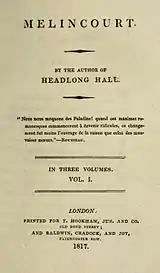 Melincourt is the second novel of Thomas Love Peacock, published in 1817. It is based on the "idea of an orang-outang mimicking humanity"[1] (see James Burnett, Lord Monboddo). An orangutan called Sir Oran Haut-ton is put forward as a candidate for election as a Member of Parliament.