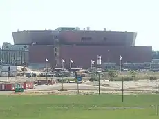 The logo for the Contest, the now-familiar five spotlights, has not been altered since its interception in 2002, and remained in use for the 2009 Contest. The first details of the stage for this year's contest were released on 29 January 2009, a week before the first heat in Gothenburg. The first plans of the stage were made during the summer of 2008 and was, for the third time, designed by Viktor Brattström, with the intention to provide a feeling of endlessness: "The audience will get the feeling of not knowing where the stage starts or ends, not knowing what's coming up around the corner".[9][10]