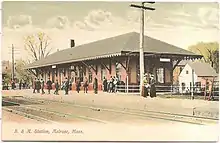 Historically the primary station in Melrose, it has always been supplemented by nearby Wyoming Hill station and Melrose Highlands station.[2] The original station was on the east side of the tracks; it was replaced by a newer station on the west side and converted for use as a freight house.[3][6][7] Neither station building is extant, though sections of the platform roofs remain as shelters.[8]
